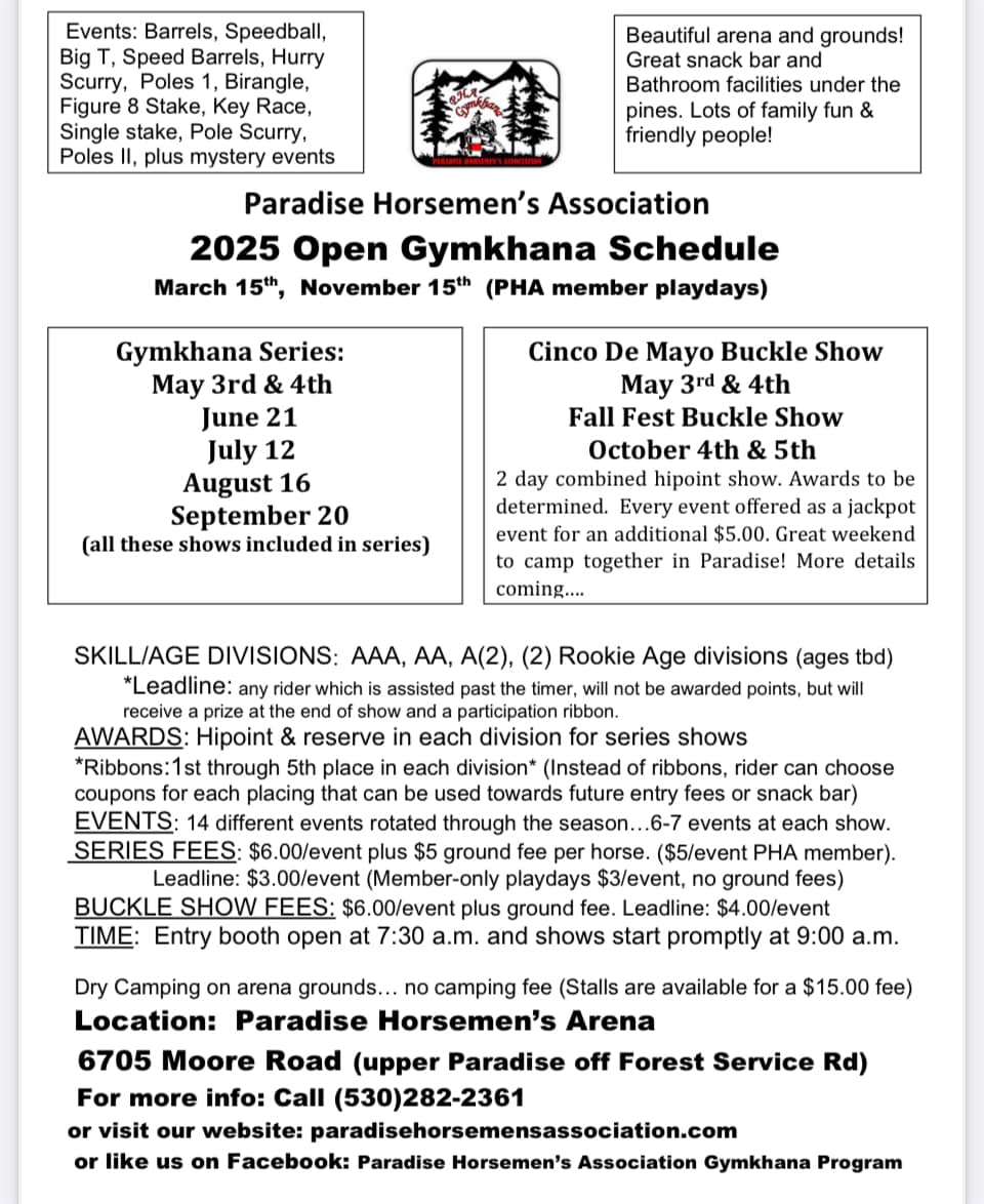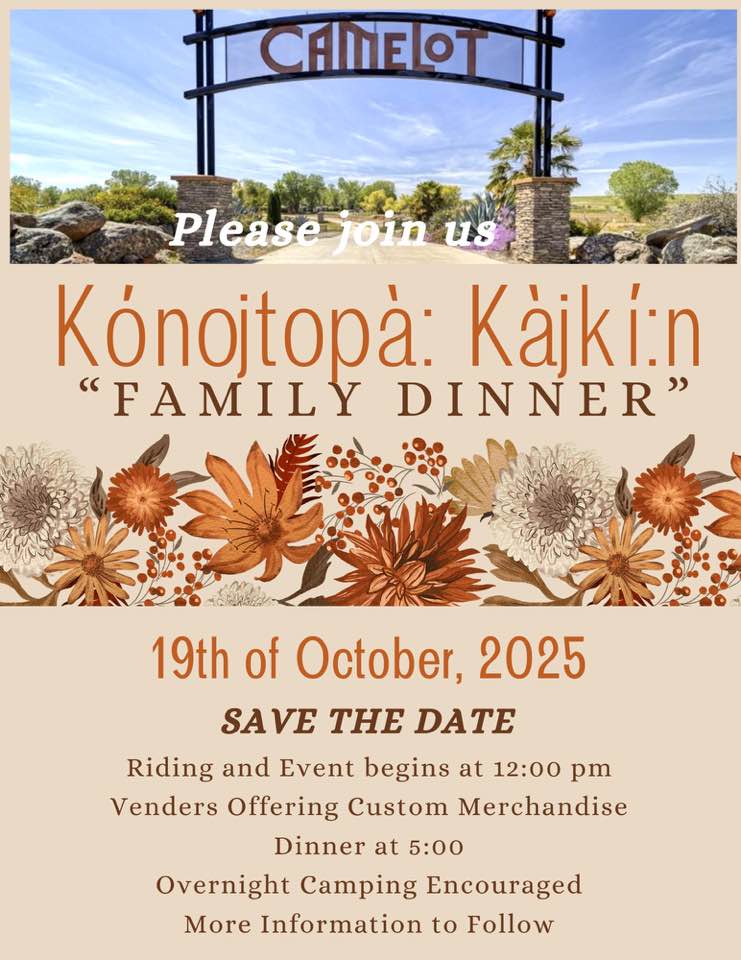 Camelot Equestrian Park 1985 Clark Rd, OrovilleDescription: : SAVE THE DATE 12pm Riding and Event begins - vendors offering custom merchandise 5pm Dinner Overnight camping encouraged! Hosted by: Camelot Equestrian Park How to Sign Up: More info to come. Contact Camelot Equestrian Park with any questions 530-966-5605