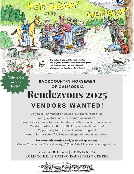 The Equestrian Center at Rolling Hills Casino and Resort 2655 Everett Freeman Way, Corning, CA, United StatesDescription: The BCHC Rendezvous follows a tradition of gathering together of outdoor enthusiasts. Our event features equine training clinicians, scores of vendors, horse and mule packing seminars, Gentle Use/ Leave No Trace classes, Western Art Show, Awards and Accolades, Dutch Oven Cook-off, Trail Challenge, Beer and Wine tasting, Cowboy Church, Youth Classes, Raffles and Auction....