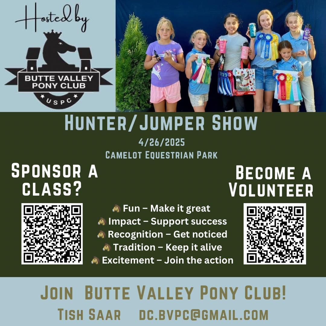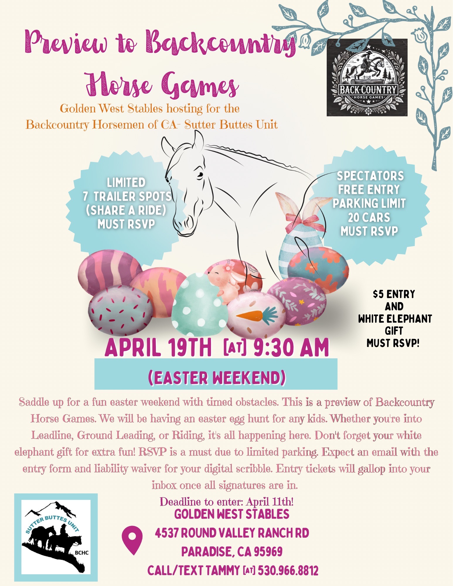 Camelot Equestrian Park 1985 Clark Rd, Oroville, CA, United StatesDescription: Mounted Egg hunt. Multiple Prizes! Grand Prize 1 Annual Pass to Camelot! Space is limited! Ticket includes lunch by Tacos Super Tonaya Rain or Shine Event. Event Facebook page. Cost: 13&up - $40, 12&Under - $14, Family of Four - $100 Hosted by: Sheyenne Shanks and Camelot Equestrian Park How to sign up: Non-refundable...